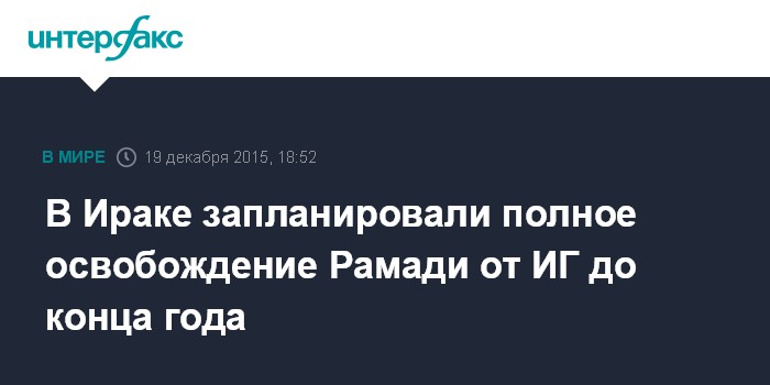 Москва. 19 декабря. INTERFAX.RU - Иракские военные и ополченцы при поддержке с воздуха возглавляемой США коалиции до конца года выбьют боевиков ИГИЛ (запрещена в РФ) из города Рамади, заявил в субботу министр обороны Ирака Халед аль-Обейди.