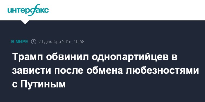 Москва. 20 декабря. INTERFAX.RU - Кандидат в президенты США от Республиканской партии Дональд Трамп заявил, что критика со стороны однопартийцев по поводу обмена любезностями с Владимиром Путиным объясняется исключительно завистью. По его словам, с Россией можно выстроить партнерские отношения, и это поможет Америке сэкономить бюджет.