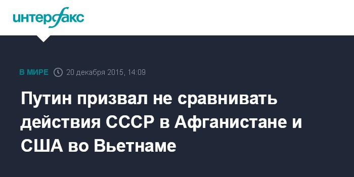 Москва. 20 декабря. INTERFAX.RU - Президент России Владимир Путин считает неправильным проводить параллели между действия СССР в Афганистане и действия США во Вьетнаме, хотя признает, что в целом афганская кампания Москвы была ошибкой.
