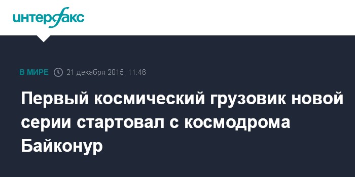 Москва. 21 декабря. INTERFAX.RU - Первый космический "грузовик" новой серии стартовал с космодрома Байконур.
