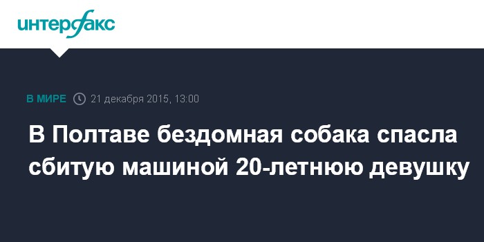 Москва. 21 декабря. INTERFAX.RU - В Полтаве бездомная собака спасла 20-летнюю девушку, которую сбили в ДТП и вывезли умирать в лес.