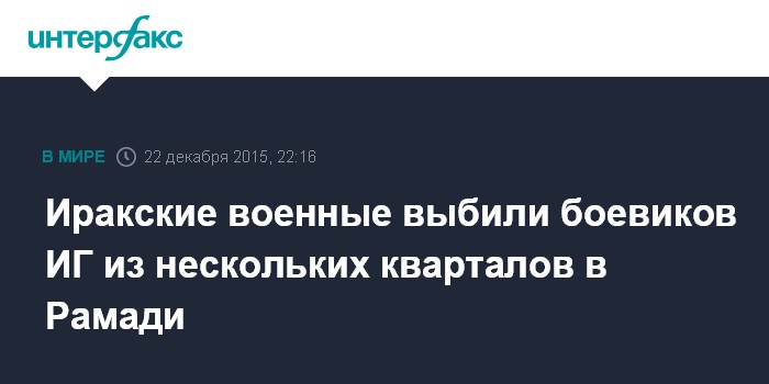 Москва. 22 декабря. INTERFAX.RU - Иракские военные при поддержке сотрудников полиции и суннитских ополченцев сумели выбить террористов ИГ (организация, запрещенная в РФ) из нескольких кварталов в центре города Рамади, сообщило агентство ЭФЭ со ссылкой на источники в силах безопасности Ирака.