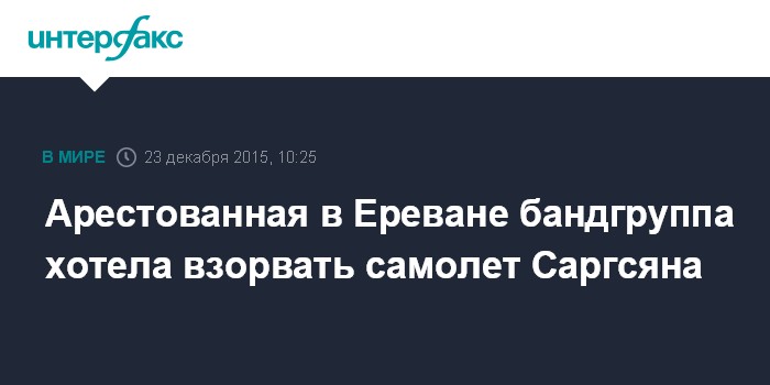 Москва. 23 декабря. INTERFAX.RU - Нейтрализованная в ноябре Службой национальной безопасности (СНБ) Армении преступная группировка планировала захват госучреждений республики и атаку на самолет президента Сержа Саргсяна, утверждает армянская газета "Грапарак" со ссылкой на источник.