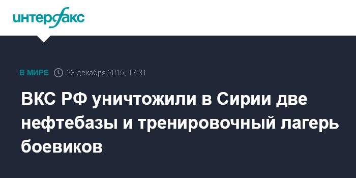 Москва. 23 декабря. INTERFAX.RU - Российская авиация уничтожила на территории Сирии две базы хранения нефтепродуктов и крупный тренировочный лагерь террористов, сообщил официальный представитель Минобороны РФ Игорь Конашенков.