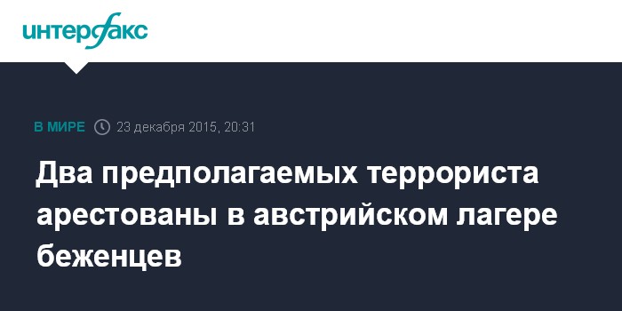 Москва. 23 декабря. INTERFAX.RU - Полиция Австрии арестовала двух сирийцев в лагере беженцев на юге страны по подозрению в принадлежности к террористическим группировкам, сообщают в среду западные СМИ.