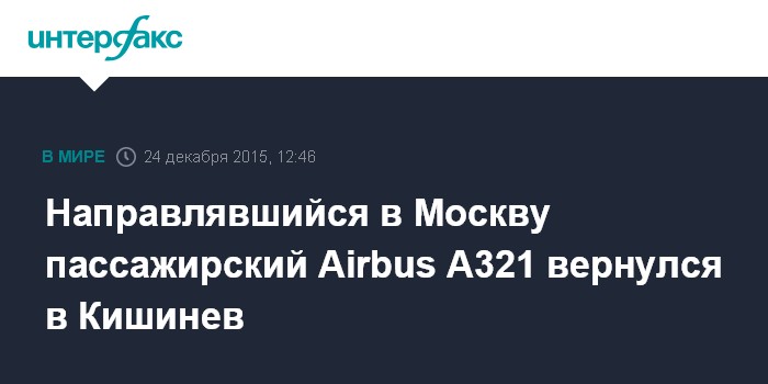 Москва. 24 декабря. INTERFAX.RU - Самолет российской авиакомпании, направлявшийся из Кишинева в Москву, благополучно вернулся в аэропорт вылета, сообщил "Интерфаксу" источник в экстренных службах.