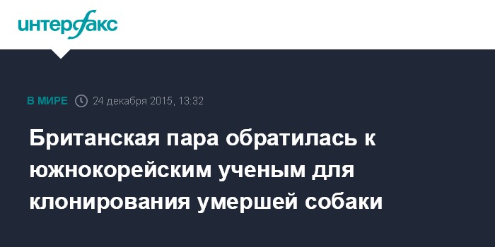 Москва. 24 декабря. INTERFAX.RU - Лора Джейкс и Ричард Римд стали первыми клиентами из Великобритании, которые обратились в биотехнологический исследовательский фонд "Суам" в Южной Корее для клонирования своей умершей собаки, пишет в четверг британская газета The Guardian.