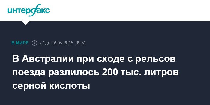 Москва. 27 декабря. INTERFAX.RU - Около 200 тыс. литров серной кислоты и и дизельное топливо разлилось в результате схода с рельсов грузового поезда в Австралии, сообщают в воскресенье местные СМИ.
