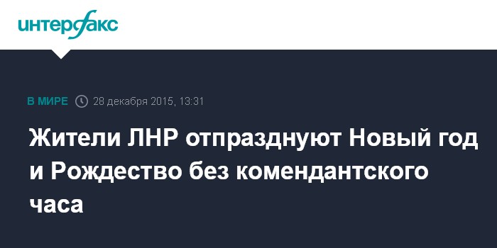 Москва. 28 декабря. INTERFAX.RU - На территории самопровозглашенной Луганской народной республики (ЛНР) на время новогодних праздников отменят комендантский час, сообщил глава ЛНР Игорь Плотницкий.