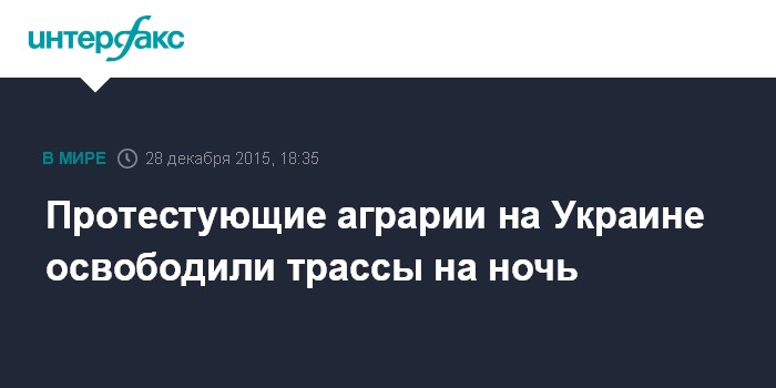Москва. 28 декабря. INTERFAX.RU - На Украине протестующие против частичной отмены спецрежима по налогу на добавленную стоимость (НДС) аграрии освободили дороги на ночь, акция протеста будет продолжена утром 29 декабря.