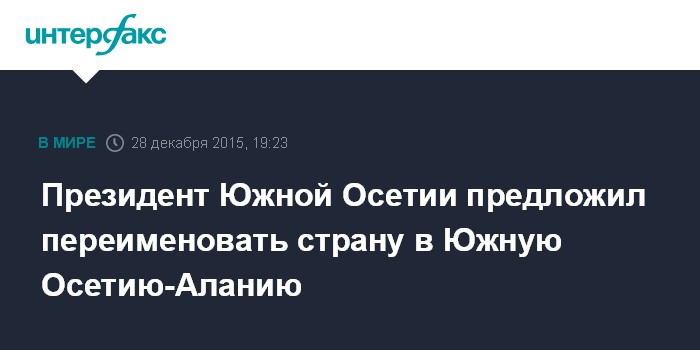 Москва. 28 декабря. INTERFAX.RU - Президент Южной Осетии Леонид Тибилов заявил, что поручит соответствующим службам республики, заняться подготовкой вопроса о переименовании республики в Республику Южная Осетия-Алания.