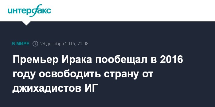 Москва. 28 декабря. INTERFAX.RU - Премьер-министр Ирака Хайдер аль-Абади пообещал изгнать с территории страны боевиков "Исламского государства" (И, террористическая организация, запрещенная в РФ) в течение 2016 года.