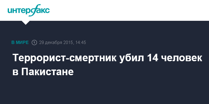 Москва. 29 декабря. INTERFAX.RU - Атака террориста-смертника привела во вторник к гибели 14 человек на северо-западе Пакистана, сообщают западные СМИ.