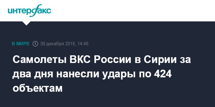 Москва. 30 декабря. INTERFAX.RU - За прошедшие двое суток самолеты Воздушно-космических сил (ВКС) России выполнили в Сирии 121 боевой вылет, удары наносились по 424 целям террористов в девяти провинциях страны, сообщил в среду представитель Минобороны РФ генерал-майор Игорь Конашенков.