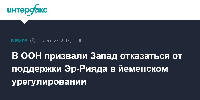 Москва. 31 декабря. INTERFAX.RU - В ООН считают, что США и другие страны Запада должны отказаться от односторонней поддержки Эр-Рияда в процессе урегулирования ситуации в Йемене.