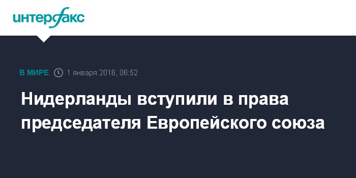 Москва. 1 января. INTERFAX.RU - Мандат очередного сменного председателя Европейского союза с 1 января переходит на полгода к Нидерландам от Люксембурга.