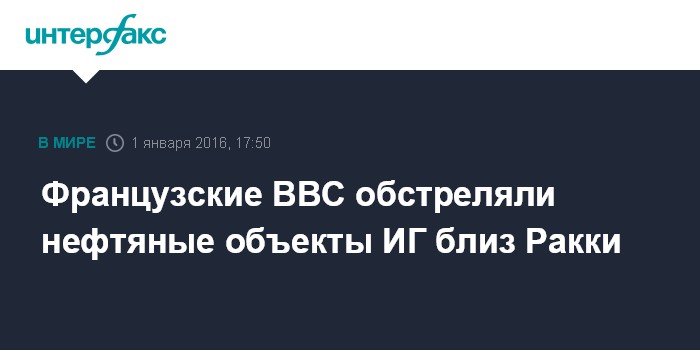 Москва. 1 января. INTERFAX.RU - Самолеты ВВС Франции нанесли в ночь на пятницу удары по находящимся под контролем ИГ (запрещенная в РФ организация) нефтяным объектам близ сирийского города Ракка, заявил в пятницу французский министр обороны Жан-Ив Ле Дриан.