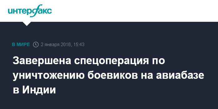 Москва. 2 января. INTERFAX.RU - Боевики, совершившие нападение на авиабазу на севере Индии, уничтожены спустя 14 часов операции по их вытеснению с объекта, сообщили в субботу сотрудники местной полиции.
