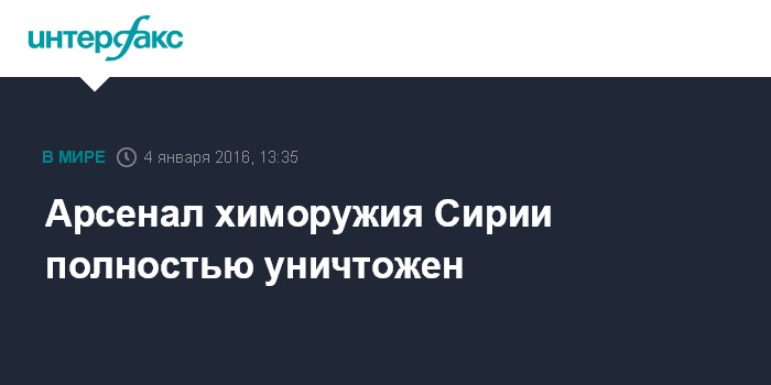 Москва. 4 января. INTERFAX.RU - Процесс ликвидации арсенала химического оружия Сирии завершен, сообщает в понедельник Организация по запрещению химического оружия (ОЗХО).