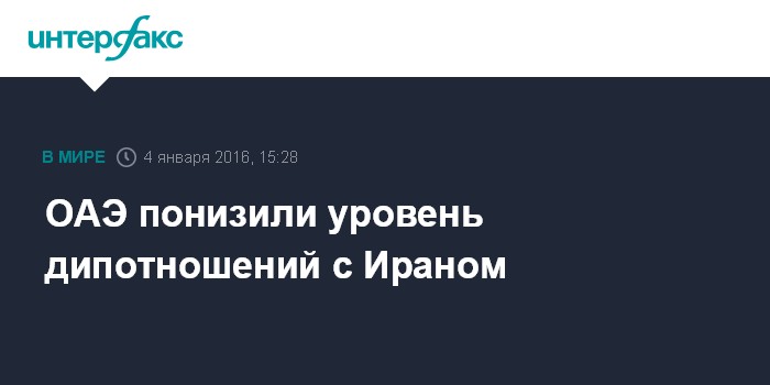 Москва. 4 января. INTERFAX.RU - Объединенные Арабские Эмираты понижают уровень дипломатических отношений с Ираном до уровня поверенного в делах, сообщают в понедельник арабские СМИ.