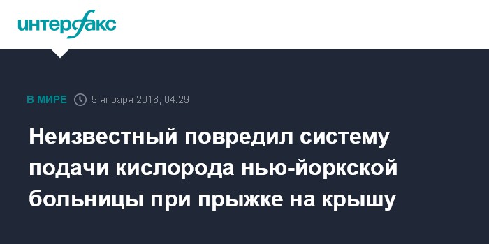 Москва. 9 января. INTERFAX.RU - Неизвестный мужчина спрыгнул с крыши больницы Святого Луки в Манхэттене и, приземлившись, повредил систему подачи кислорода пациентам, сообщило агентство Associated Press.
