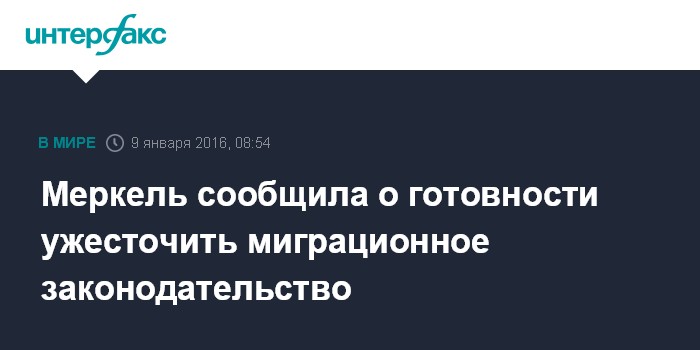 Москва. 9 января. INTERFAX.RU - Канцлер ФРГ Ангела Меркель заявила, что рассмотрит меры, облегчающие процедуру депортации мигрантов, совершивших преступления, сообщила в субботу BBC News.