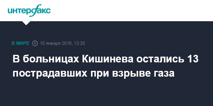 Москва. 10 января. INTERFAX.RU – В Кишиневе 13 человек остаются госпитализированными после взрыва газового баллона, трое - в критическом состоянии, сообщила министр здравоохранения Молдавии Руксанда Главан на специальном заседании правительства в воскресенье.