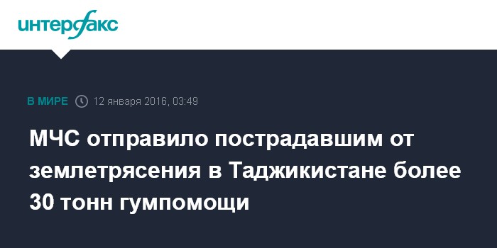 Москва. 12 января. INTERFAX.RU - МЧС России направило в Таджикистан, пострадавший от землетрясения, более 32 тонн гуманитарной помощи.