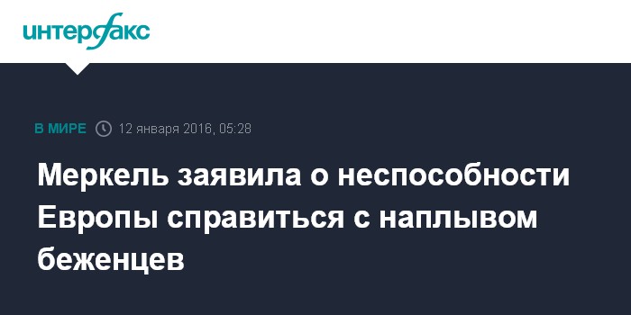 Москва. 12 января. INTERFAX.RU - Европейские государства, как показывают последние события, оказались не готовыми к тому наплыву мигрантов, с которыми они столкнулись в минувшем году, признала канцлер ФРГ Ангела Меркель.