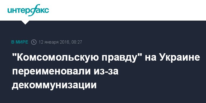 Москва. 12 января. INTERFAX.RU - Газета "Комсомольская правда" в Украине" в связи с действующим в стране законом о декоммунизации изменила свое название на "КП" в Украине", сообщается на сайте издания.
