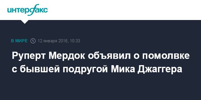 Москва. 12 января. INTERFAX.RU - Американский медиамагнат Руперт Мердок объявил о помолвке с 59-летней бывший моделью Джерри Холл. Соответствующее объявление было размещено в очередном номере британской газеты The Times, которая принадлежит 84-летнему Мердоку.