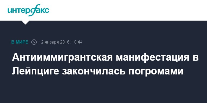 Москва. 12 января. INTERFAX.RU - Беспорядками закончилась в ночь на вторник манифестация против иммигрантов в Лейпциге, организованная местным отделением антиисламистской организации "Пегида", сообщают местные СМИ.