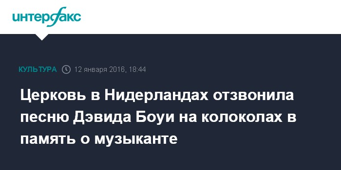 Москва. 12 января. INTERFAX.RU - Колокола на церкви в голландском Утрехте отзвонили песню Дэвида Боуи в память о музыканте, скончавшемся накануне.