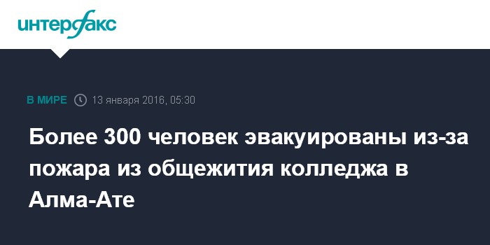 Москва. 13 января. INTERFAX.RU - В Алма-Ате произошел пожар в здании общежития республиканского колледжа спорта, сообщила агентству "Интерфакс" официальный представитель городского департамента по ЧС Сандугаш Баймухамбетова.