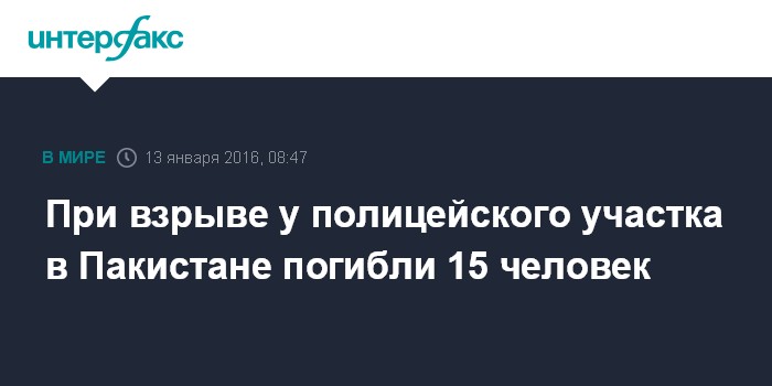 Москва. 13 января. INTERFAX.RU - Не менее 15 человек погибли в результате взрыва бомбы у полицейского участка в городе Кветта на юго-западе Пакистана.
