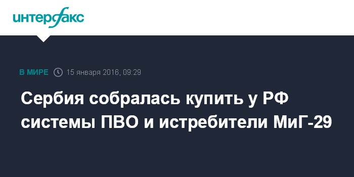 Москва. 15 января. INTERFAX.RU - Сербия заинтересовалась российскими системами ПВО типа "Тор", "Панцирь" и "Бук", а также истребителями МиГ-29, пишет газета "Коммерсант" в пятницу.