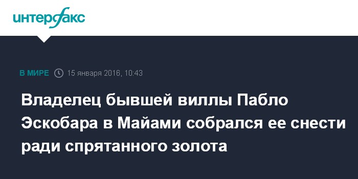 Москва. 15 января. INTERFAX.RU - Предприниматель из США Кристиан де Бердуар планирует снести купленную в 2014 году за $10 млн виллу в Майами, принадлежавшую когда-то колумбийскому наркобарону Пабло Эскобару, пишет в пятницу латиноамериканская пресса.