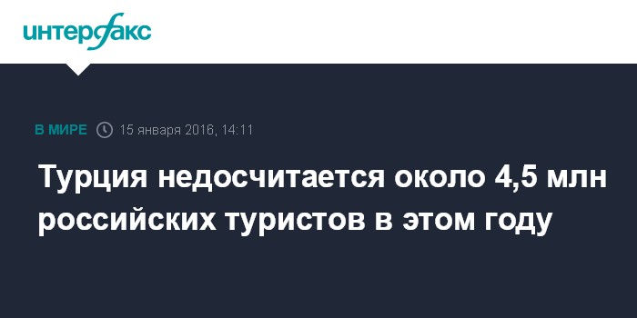 Москва. 15 января. INTERFAX.RU - В Турции посчитали, что страна потеряет около 4,5 млн туристов из России в этом году, сообщает издание Hurriyet со ссылкой на министра культуры и туризма страны Махира Унала.
