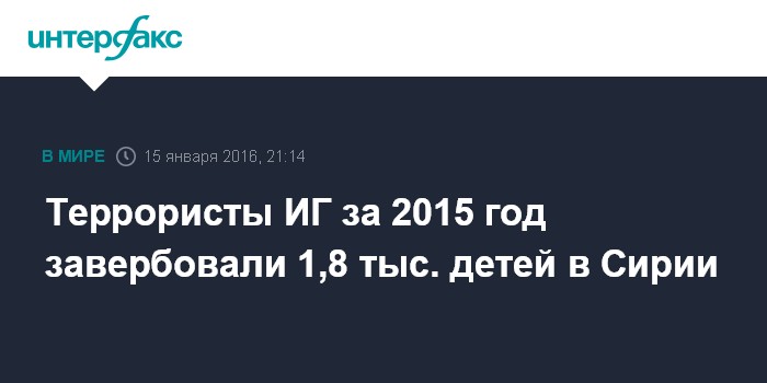 Москва. 15 января. INTERFAX.RU - Террористы из группировки ИГ (запрещена в РФ) за 2015 год приняли в свои ряды около 1,8 тысяч сирийских детей, сообщает в пятницу агентство EFE со ссылкой на данные Наблюдательного совета по правам человека в Сирии.