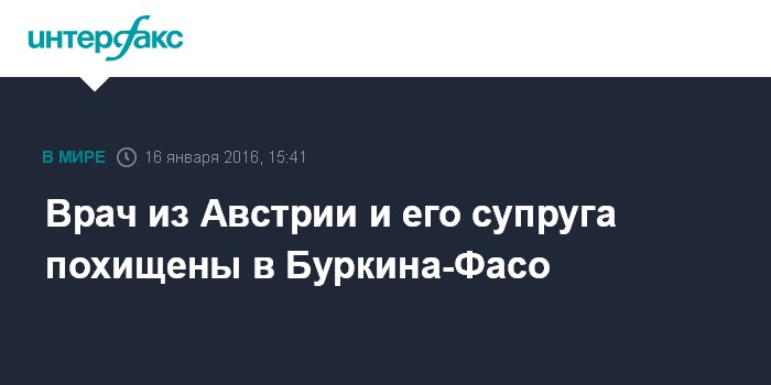 Москва. 16 января. INTERFAX.RU - Супружеская пара из Австрии похищена на севере Буркина-Фасо, в приграничном с Мали регионе, сообщает в субботу агентство The Associated Press.