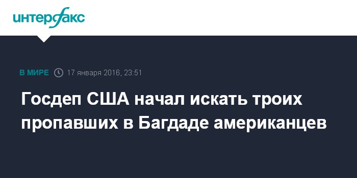 Москва. 17 января. INTERFAX.RU - Государственный департамент США начал поиски троих граждан, похищенных в Багдаде в воскресенье, сообщила BBC News.
