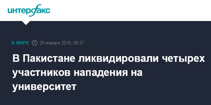 Москва. 20 января. INTERFAX.RU - Пакистанские силы безопасности ликвидировали четырех участников нападения на университет в городе Чарсадда на северо-востоке Пакистана, сообщает в среду сайт газеты The Times of India.