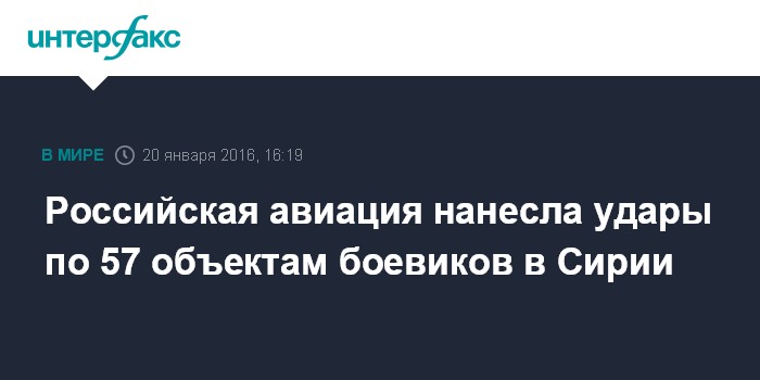 Москва. 20 января. INTERFAX.RU - За минувшие сутки самолеты ВКС РФ выполнили 16 боевых вылетов и нанесли удары по 57 объектам инфраструктуры боевиков в Сирии, сообщил в среду журналистам начальник управления пресс-службы и информации Минобороны РФ Игорь Конашенков.