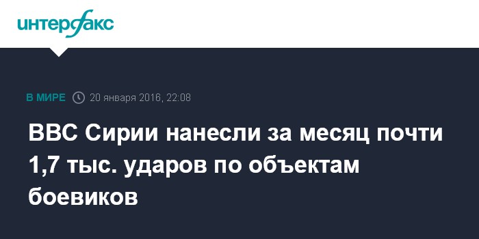 Москва. 20 января. INTERFAX.RU - Военно-воздушные силы Сирии с 27 декабря 2015 года по 20 января 2016 года совершили 481 вылет и нанесли удары по 1662 объектам экстремистов в окрестностях Дамаска, Хомса, Хамы, Алеппо и Дейр-эз-Зора, уничтожив десятки автомобилей с боевиками, сообщил официальный представитель Вооруженных сил САР бригадный генерал Али Майхуб.