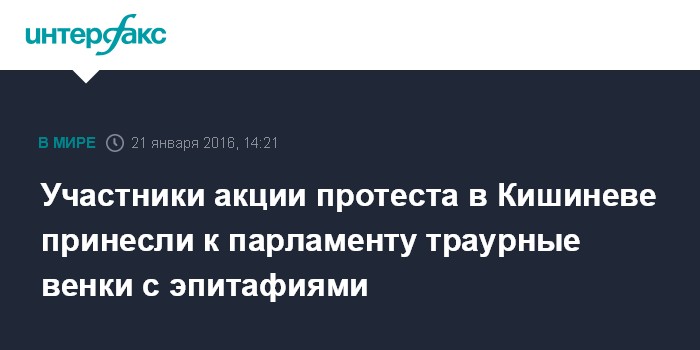 Москва. 21 января. INTERFAX.RU - Участники акции протеста в Кишиневе "проводили в последний путь" действующую в Молдавии власть, принеся к стенам парламента траурные венки с эпитафиями. Как передает корреспондент "Интерфакса" из центра Кишинева, акцию организовала "Наша партия".