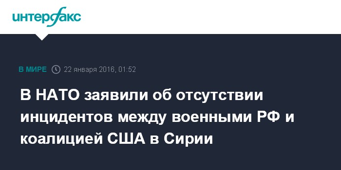 Москва. 22 января. INTERFAX.RU - В НАТО заявляют об отсутствии инцидентов между российскими военными и военными международной коалиции во главе с США, участвующими в операции в Сирии.