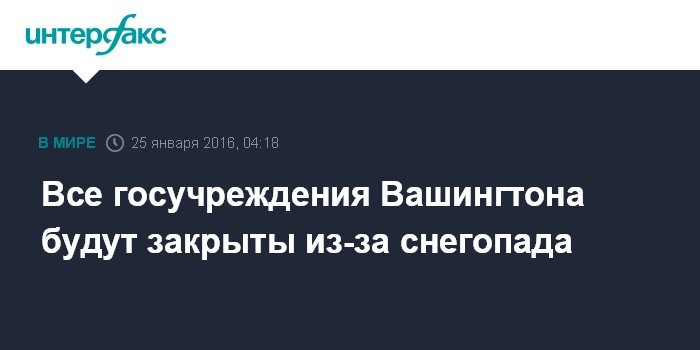 Москва. 25 января. INTERFAX.RU - Государственные учреждения и учебные заведения в Вашингтоне не будут работать в понедельник из-за сильнейшего за последние 100 лет снегопада, который обрушился на восточные районы США, проинформировало американское Управление по персоналу.