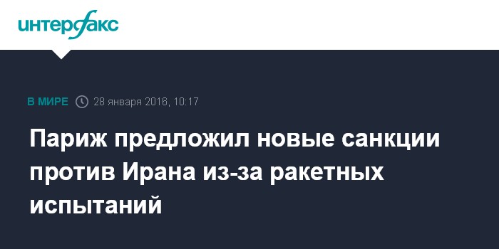 Москва. 28 января. INTERFAX.RU - Власти Франции обратились к руководству ЕС с предложением изучить возможность введения новых санкций против Ирана в связи с последними ракетными испытаниями Тегерана, сообщает в четверг агентство Associated Press со ссылкой на двух неназванных представителей ЕС.