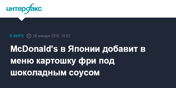 Москва. 28 января. INTERFAX.RU - Сеть ресторанов быстрого питания McDonald’s на этой неделе добавит в свое меню в Японии картофель фри под шоколадным соусом, сообщает The Guardian.