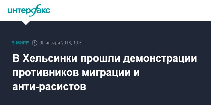 Москва. 30 января. INTERFAX.RU - В столице Финляндии в субботу прошли шествия противников прибывающих в страну мигрантов и анти-расистов.